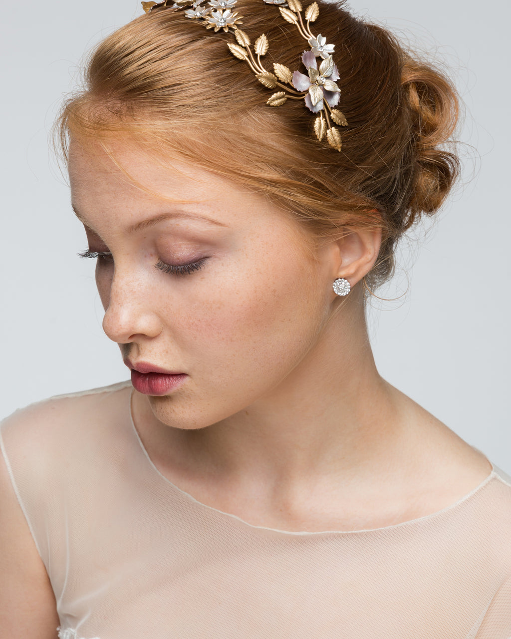 From our Luxe & Luminous Collection, this beautiful bridal headpiece is made using brass flowers & leaves, soldered together in our Melbourne workrooms. Diamond cut crystal centres with 24k Gold hand painted and finished with coats of pearl enamel. Boho Luxe Styling.