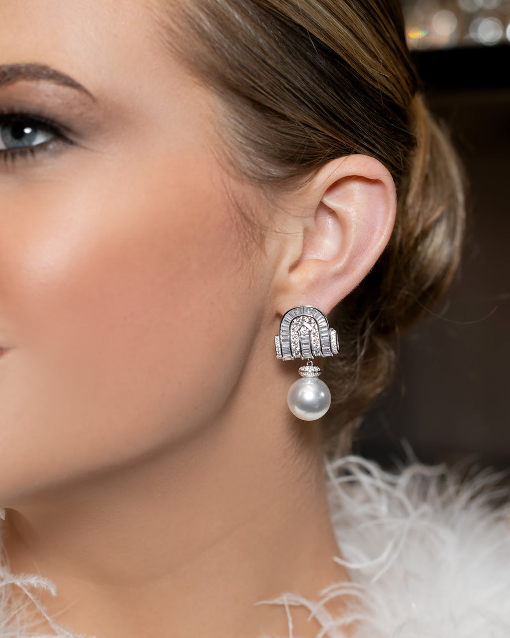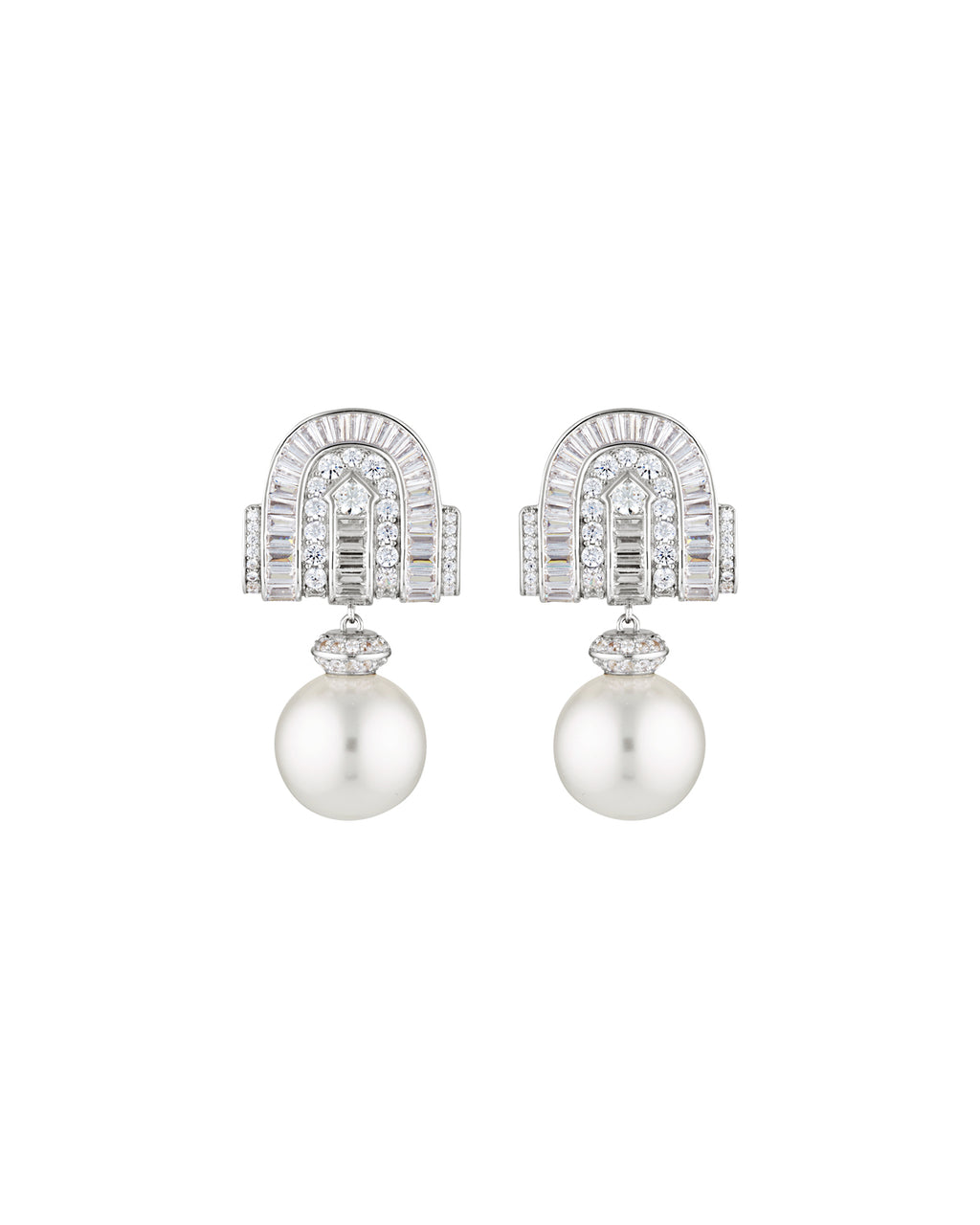 Taking glamour with Art Deco styling to the next level , the Vera earrings are a statement pearl drop earring.