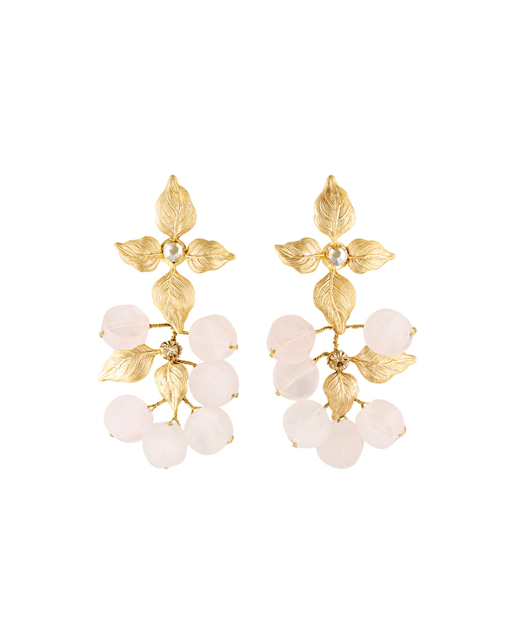 From our stunning Siam Collection and handmade by our Melbourne Artisans, the elements include a open leaf gold plated in precious metals featuring flowers with tiny swarovski crystals, with stunning drops of rose quartz. Available as a post or clip on (on request) versions. Enjoy as a pair of Bridal Earrings or any special occasion.