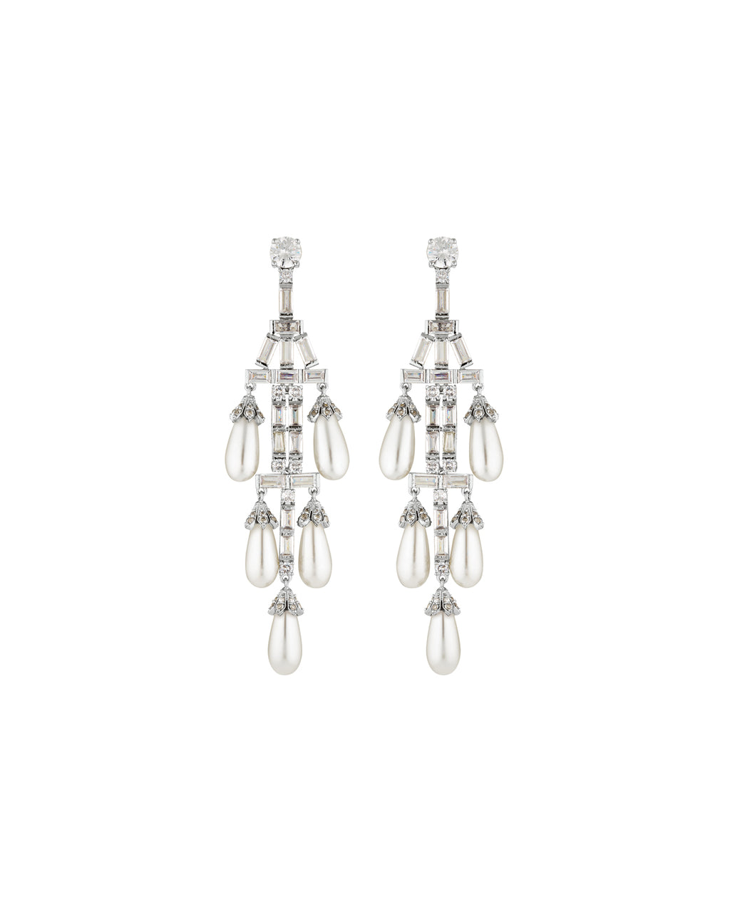 These earrings are made with fine brass as the base metal, then precious metal rhodium with hypoallergenic posts. The pearl drops have been especially crafted to fit this design, which is also available with emerald crystal.